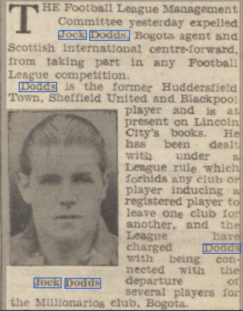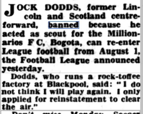 Ephraim ‘Jock’ Dodds (Lincoln City): 13 months for acting as an agent for Charlie Mitten (see entry further down the list) and other players in moves from England to Colombia, 1950. Dodds was at the end of his playing career in 1950 and though still registered to Lincoln was unlikely to continue playing, so got involved in recruiting players to join the league in Colombia, which at that time was outside Fifa control. The FA banned him indefinitely but rescinded this from August 1951, but Dodds decided not to try and revive his career at the age of 35, or move into football management, saying he had appealed the ban to “clear the air”. Dodds’ career included a losing FA Cup final appearance for Sheffield Utd against Arsenal in 1936, when he almost scored with a header against the bar. He claimed that notorious Arsenal hard man Wilf Copping had pushed him in the back. At the time of his death in 2007, he was the oldest surviving FA Cup finalist. Dodds also scored a hat-trick for Blackpool against Tranmere Rovers in two and a half minutes in a wartime match in 1942, a feat recognised by the Guinness Book of Records as the fastest ever.