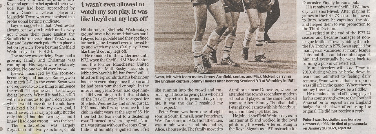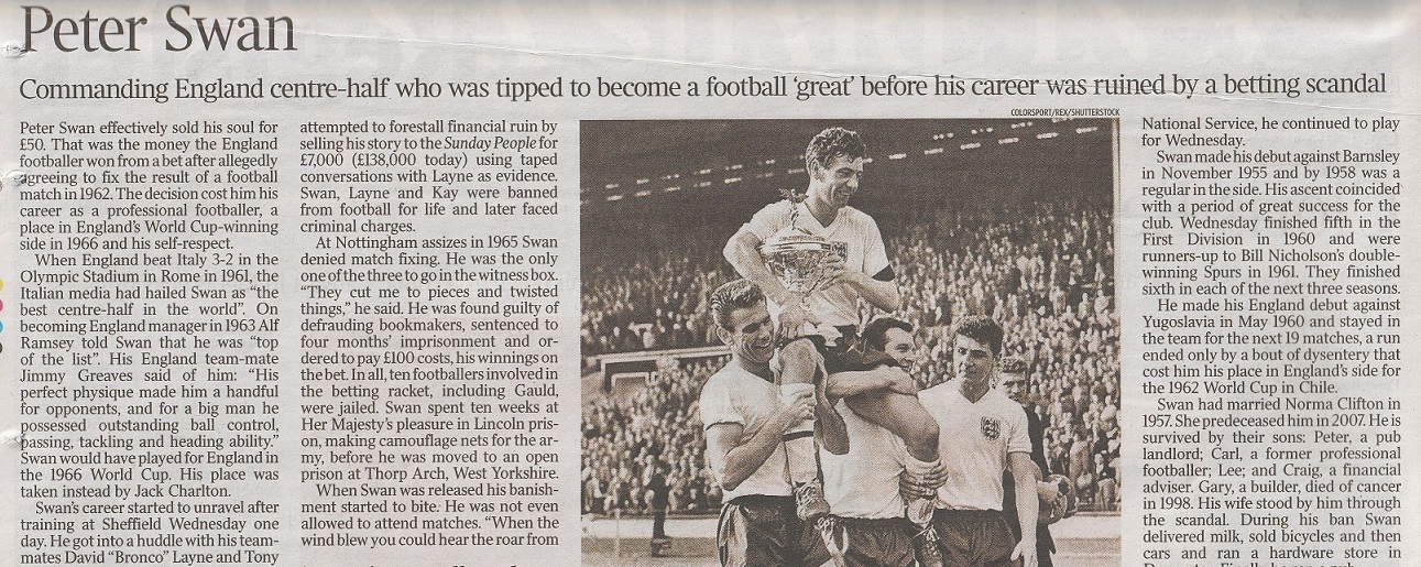 Peter Swan got back into football once his ban was lifted, re-signing for Sheffield Wednesday at the age of 36. He died in January 2021.