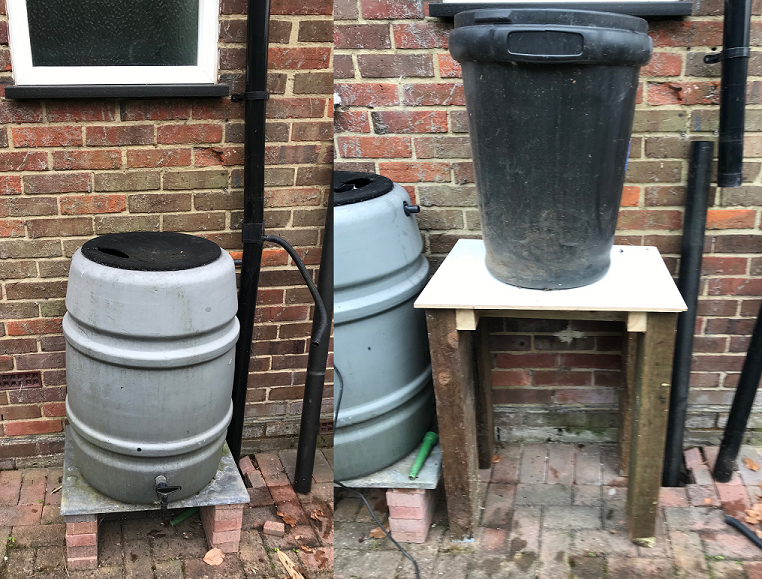I already had a water butt collecting rainwater from a downpipe directly outside the downstairs toilet. I decided to set a bin at a higher level and direct the rainwater into that, using the existing butt as an overflow for additional storage. Longer term I will need a bigger container than the 80-litre bin, but I wanted to prove this worked before sourcing something bigger. I have other butts for different sections of roof, so there’s no shortage of water, I just need more of it in one place.