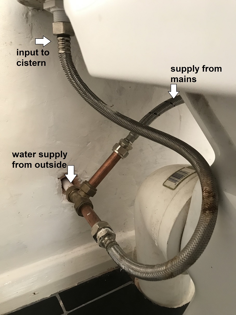 I thought it would also be useful to be able to easily switch back to the regular supply if I needed to, so I connected the new supply with the mains supply and then into the cistern. I’ve since learned that this is illegal without a non-return valve in the pipe due to the theoretical danger of contaminated rainwater being forced back up the mains pipe if both supplies were on. In practice the mains pressure is so much greater than the pressure from the rainwater supply that turning the mains supply on at the stoptap would push a continuous flow of mains water through my new pipework and into the rainwater bin outside, so I’m not concerned about this from the risk point of view.