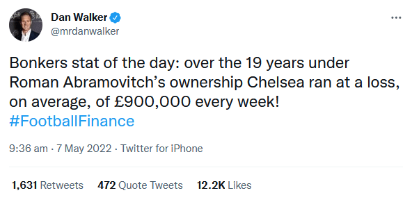 Then there’s the loans that Abramovich has made to Chelsea, which total somewhere between £1.5bn and £1.7bn depending on your source of information (call it £1.5bn for simplicity). Is that sum being repaid to Abramovich? Or paid somewhere else, or just written off? Whenever anybody has tried to compare Abramovich’s ownership with the Glasers or Kroenkes I’ve said there’s no point – their intentions are completely different, because the others want to make money and Abramovich is just writing this money off. Well, that was then and this is now. Putin’s actions have changed what Abramovich wants and can do. So is he asking for his massive loans to be repaid or not?